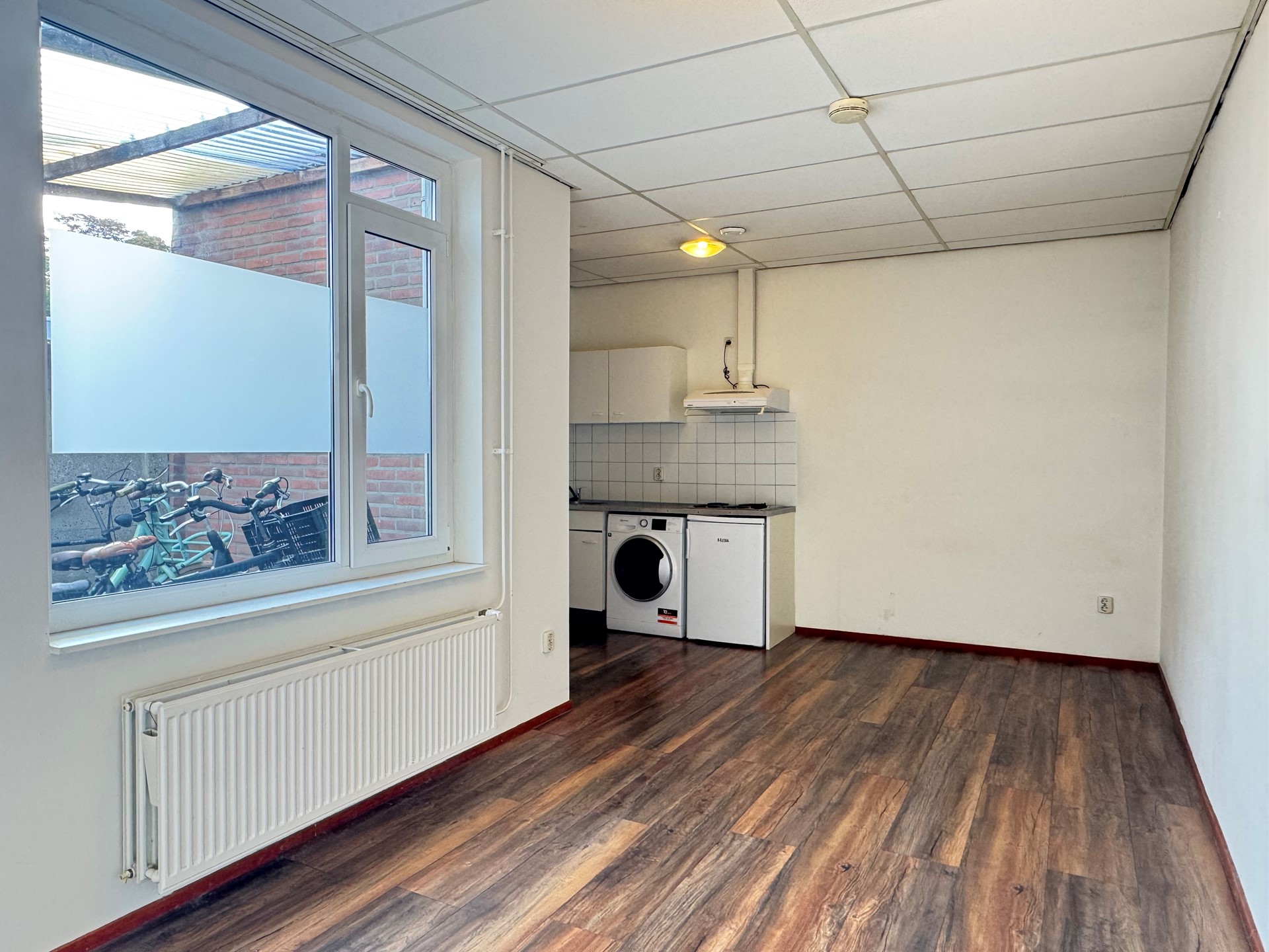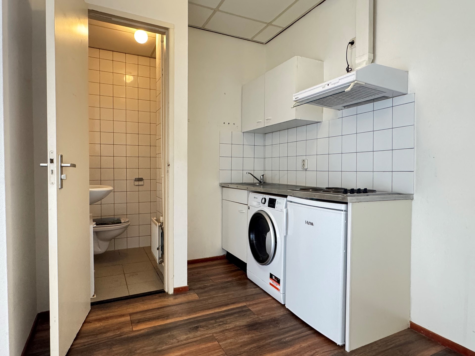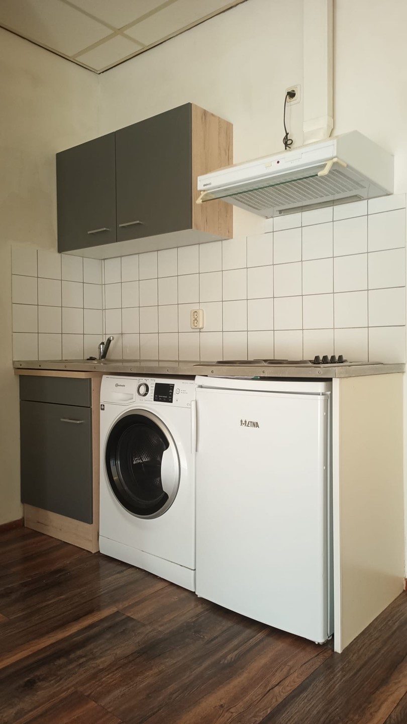 Woon- / slaapkamer - open keuken voorzien van onder- en bovenkasten, kookplaat, afzuigkap, wasmachine en koelkast.