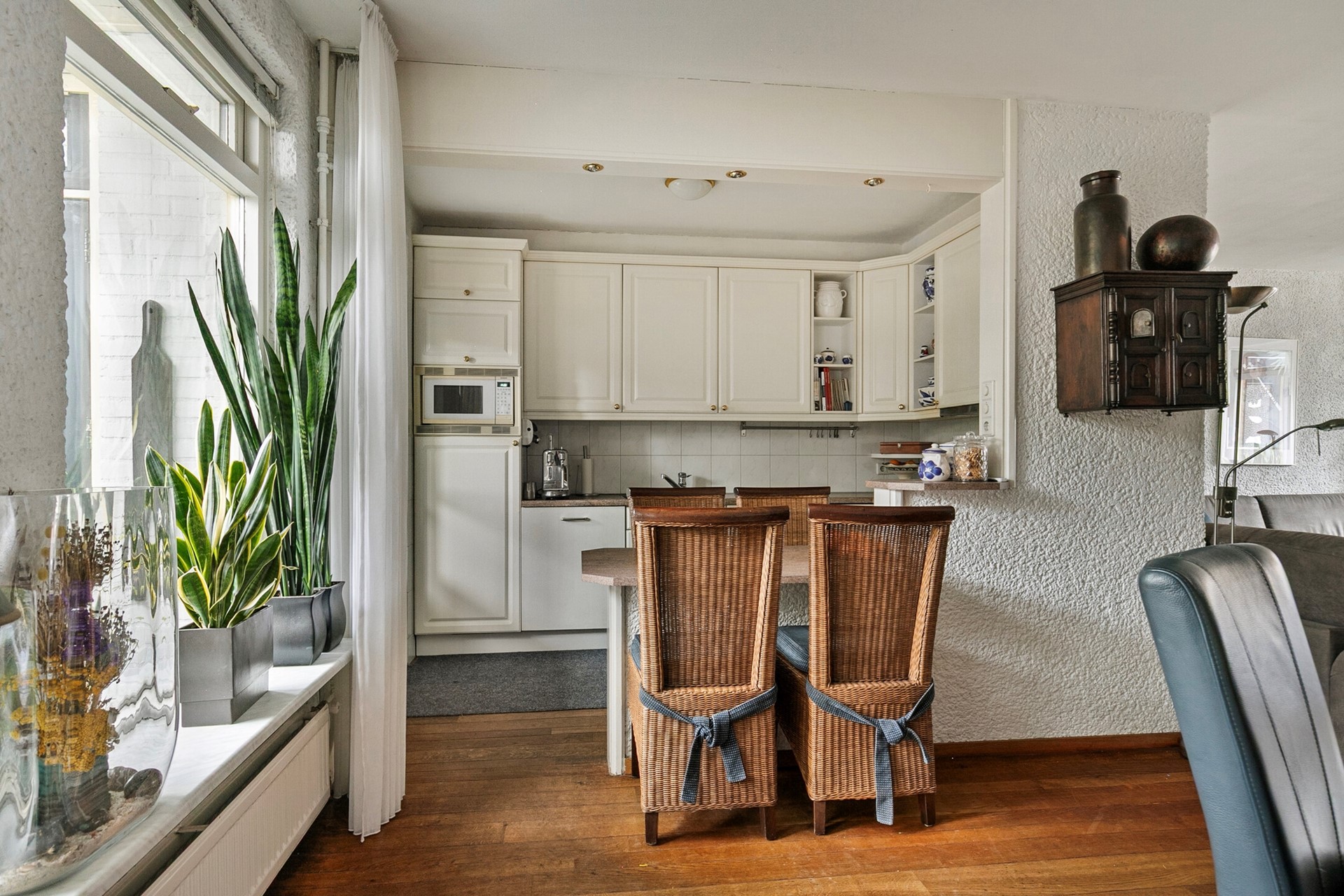 Open keuken met vaste ontbijttafel en inbouwkeuken in hoekopstelling voorzien van 1,5 rvs spoelbak, 4 pits gaskookplaat, oven, vaatwasser, magnetron en koelkast.