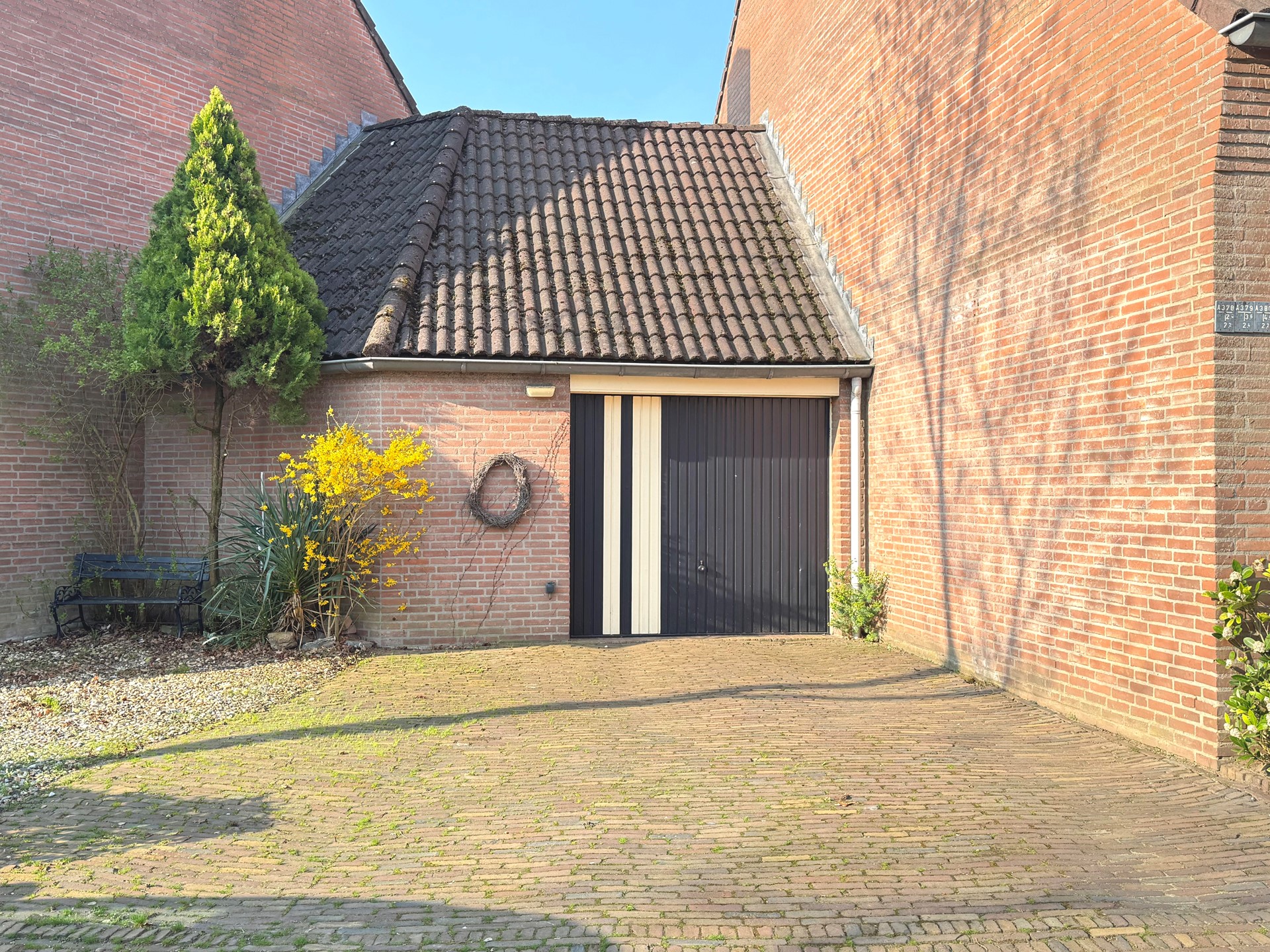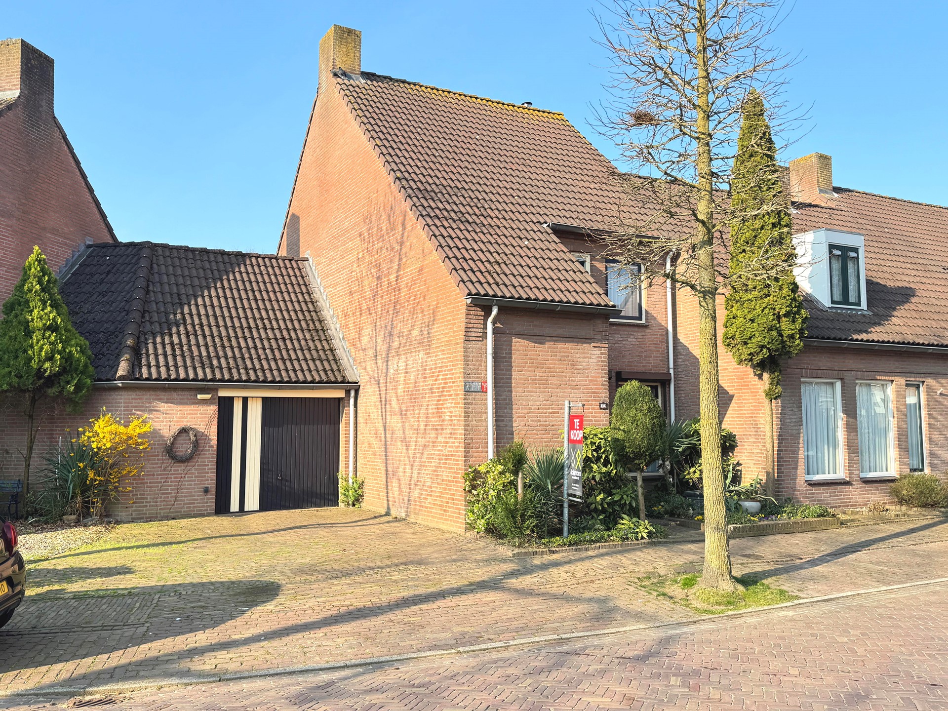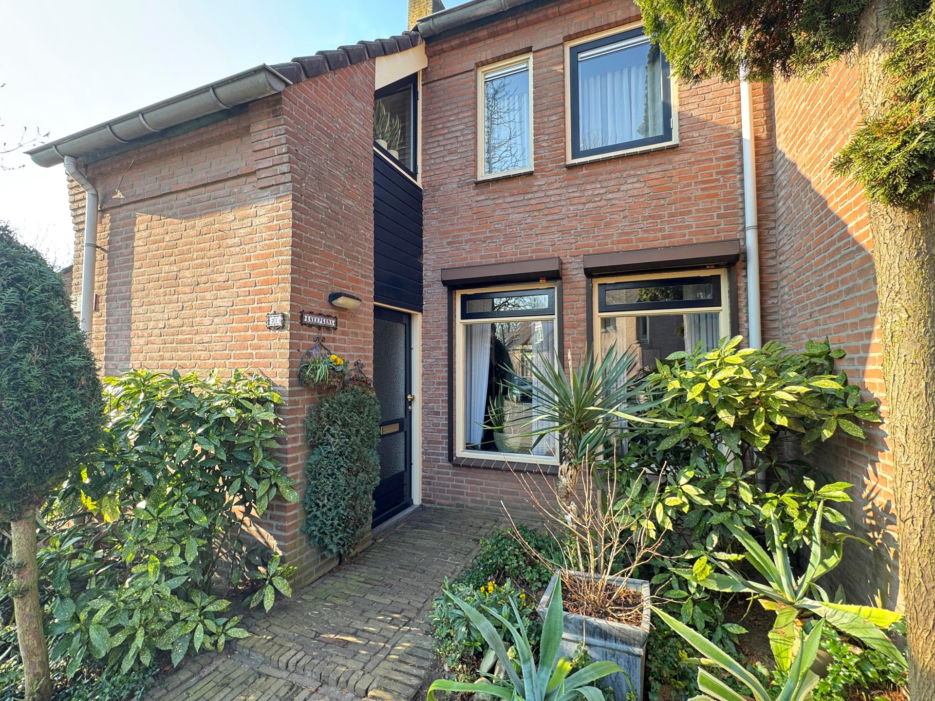 Leuke voortuin met brede oprit die plaats biedt aan twee auto’s, de meterkast bevindt zich tegen de oprit waardoor een elektrisch laadpunt eenvoudig te realiseren is.