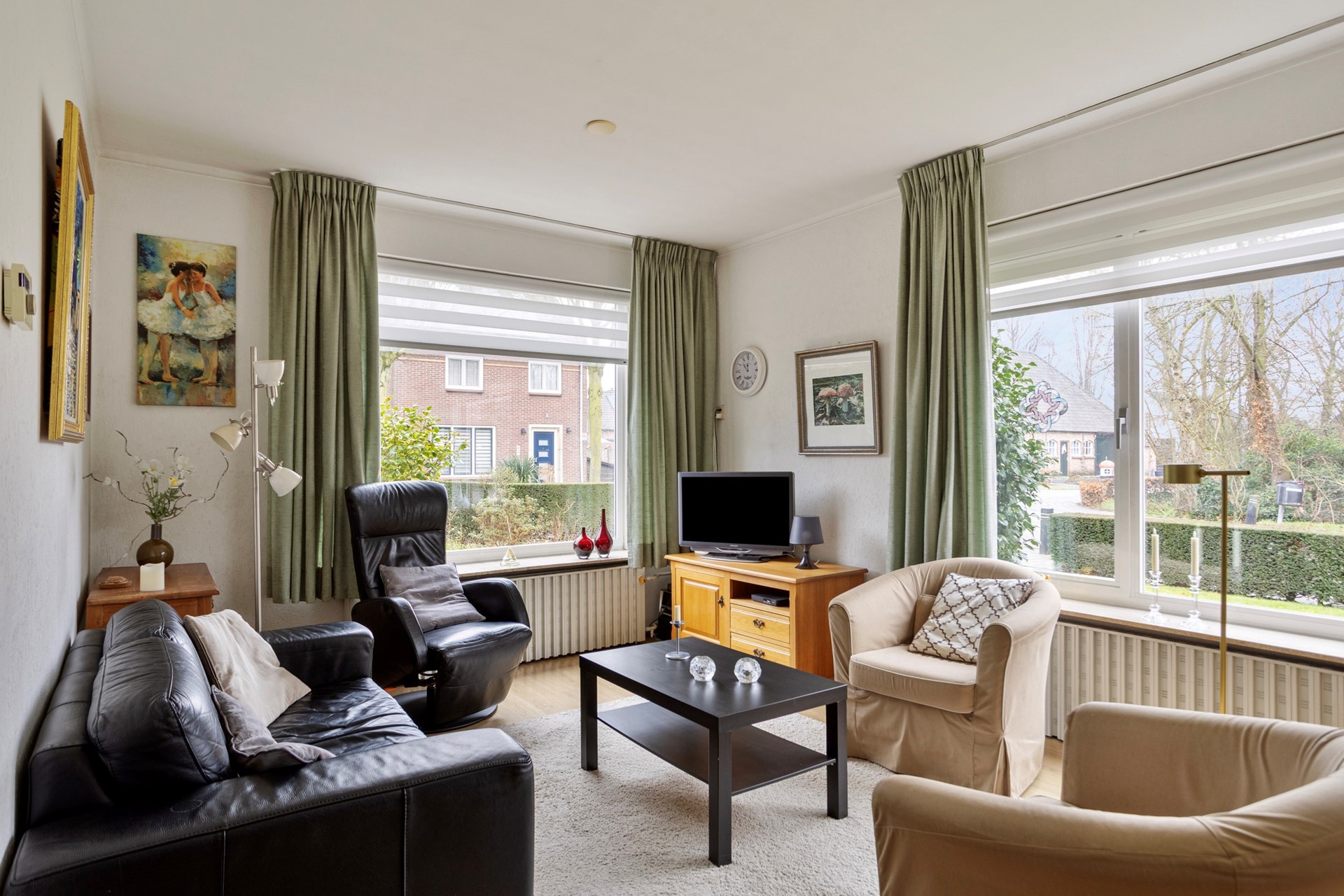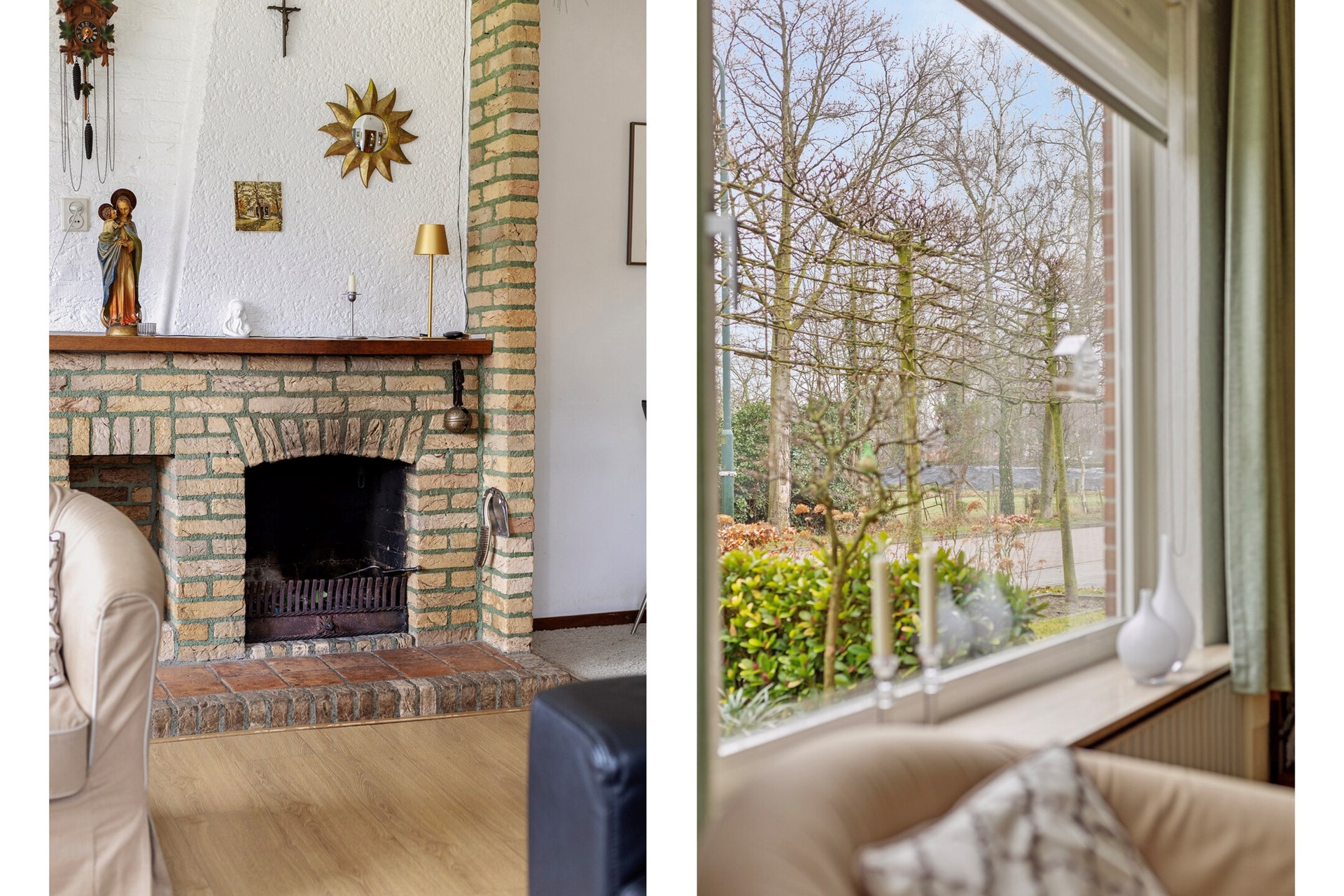 Fraaie L-vormige woonkamer met veel lichtinval en de woonkamer biedt meer dan voldoende ruimte aan een eet- en zithoek. Gezellige woonkamer met centraal opgestelde open haard in gemetselde schouw, veel lichtinval en mooi uitzicht aan twee zijden!