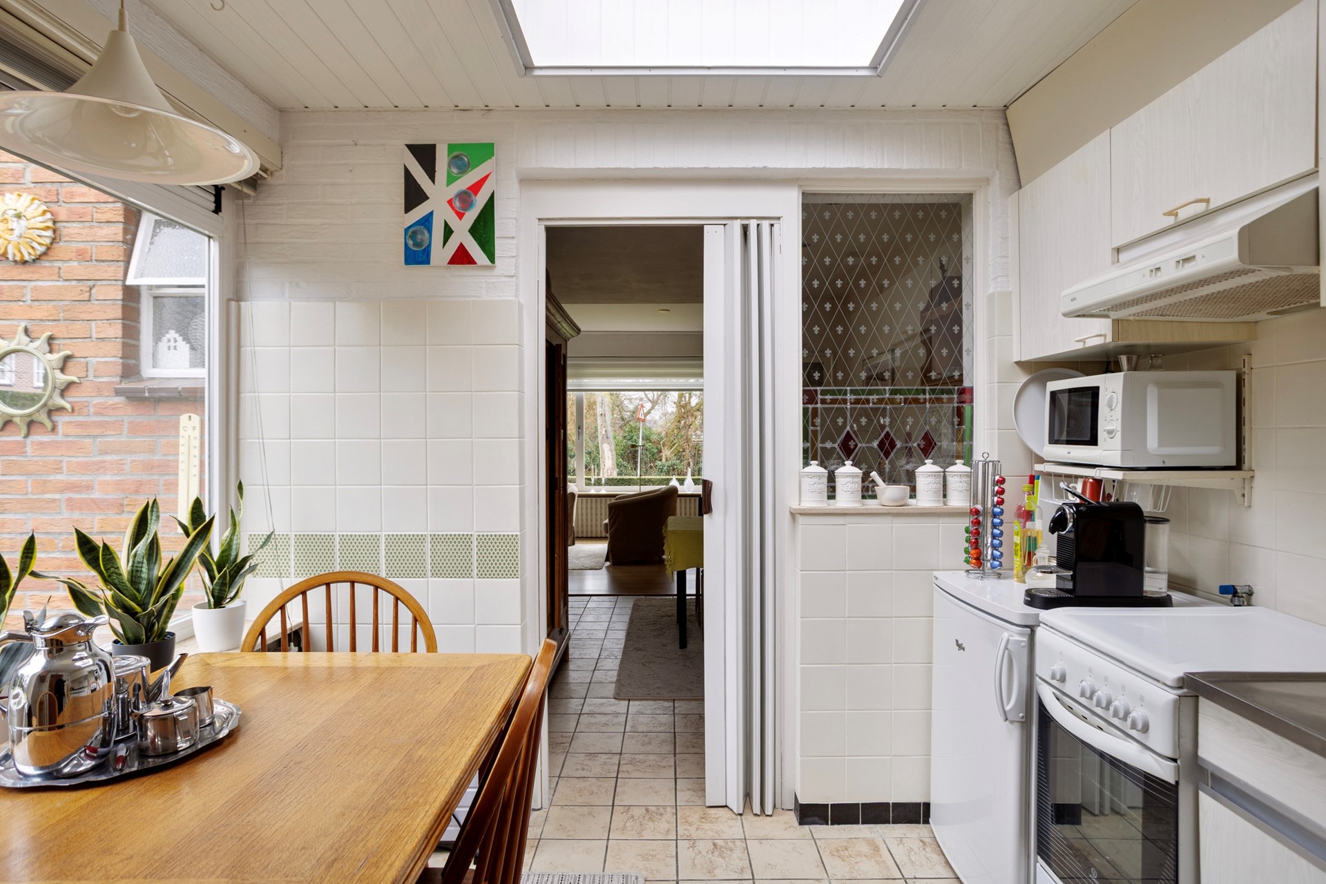 Gesloten keuken met inbouwkeuken met keukenmeubel en fornuis met 4 pits gaskookplaat, oven en afzuigkap. Vanuit de keuken is het genieten van het uitzicht op de royale tuin.