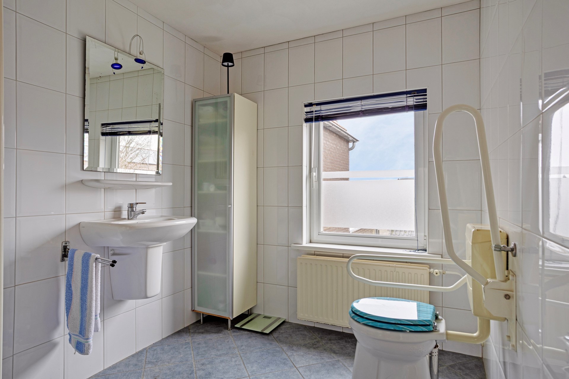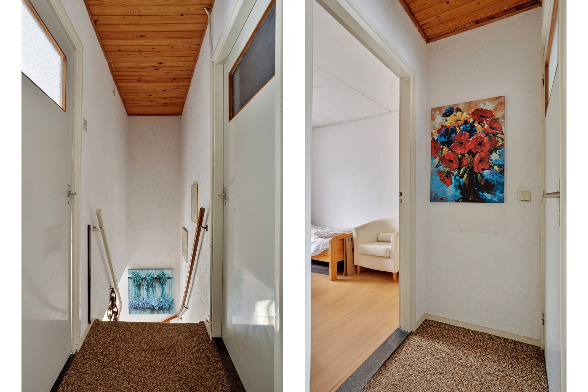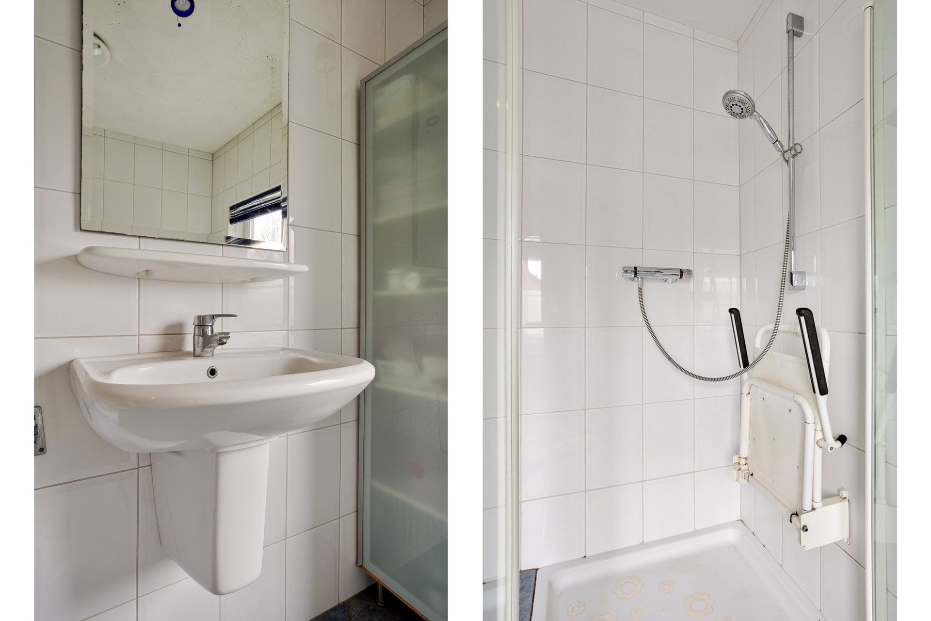 Royale hal met garderobe en meterkast voorzien van 4 groepen, 1 aardlekschakelaar en glasvezelaansluiting; 3/4e betegelde doucheruimte met wastafel en inloopdouche; halfhoog betegelde toiletruimte en 3-traps verdiepte kelderkast.