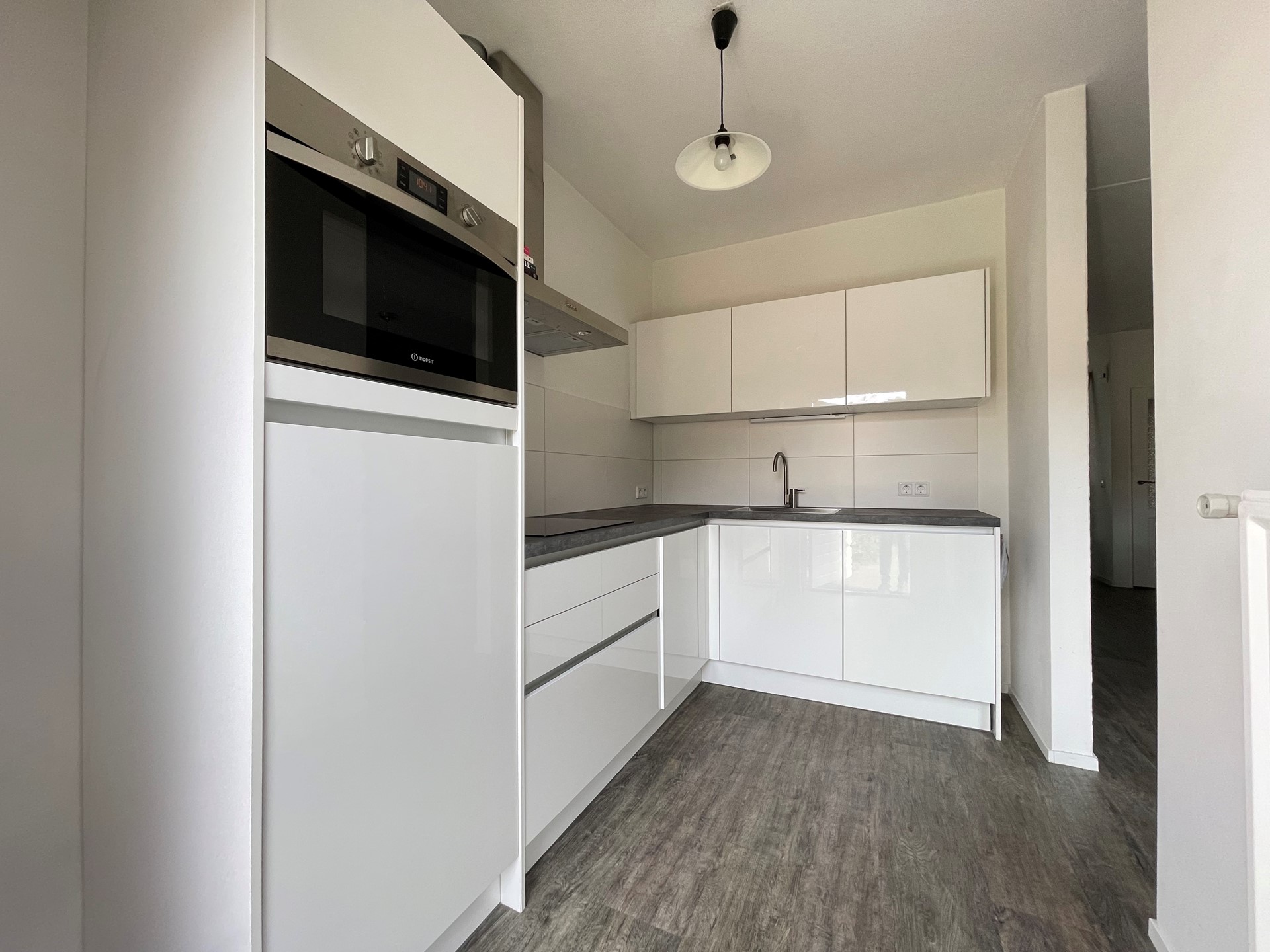 Begane grond: hal met garderobe en meterkast (8 groepen en 2 aardlekschakelaars) - L-vormige woonkamer met voldoende ruimte voor een eet- en zithoek - gesloten met moderne witte inbouwkeuken in hoekopstelling voorzien van spoelbak, inductie kookplaat, afzuigkap, koelkast, combi magnetron/oven, vaatwasser en pannencarrousel.