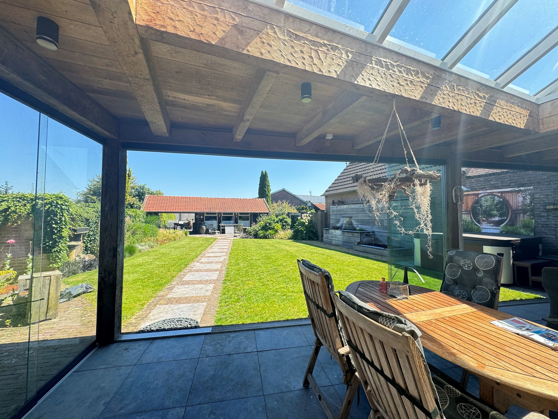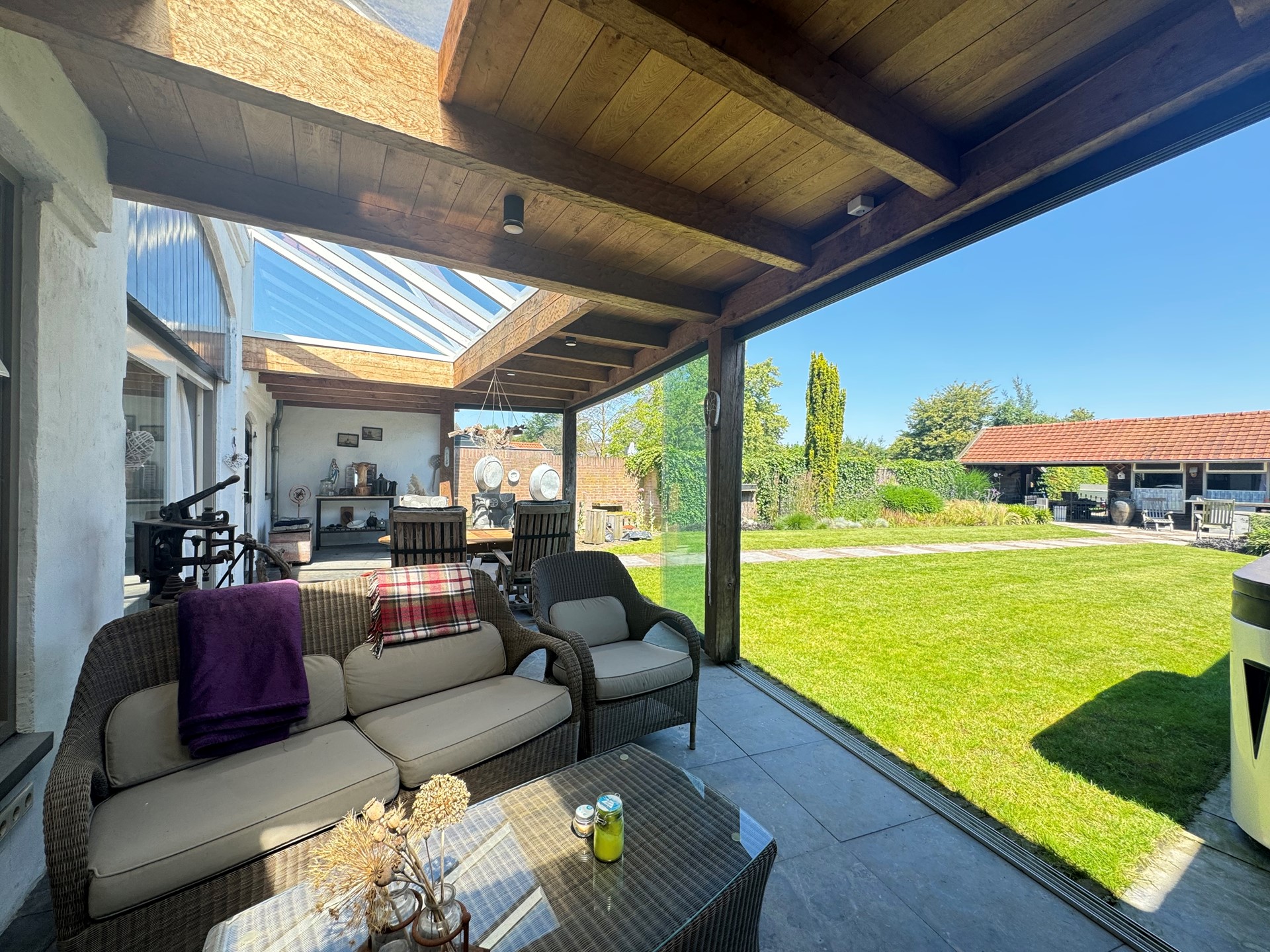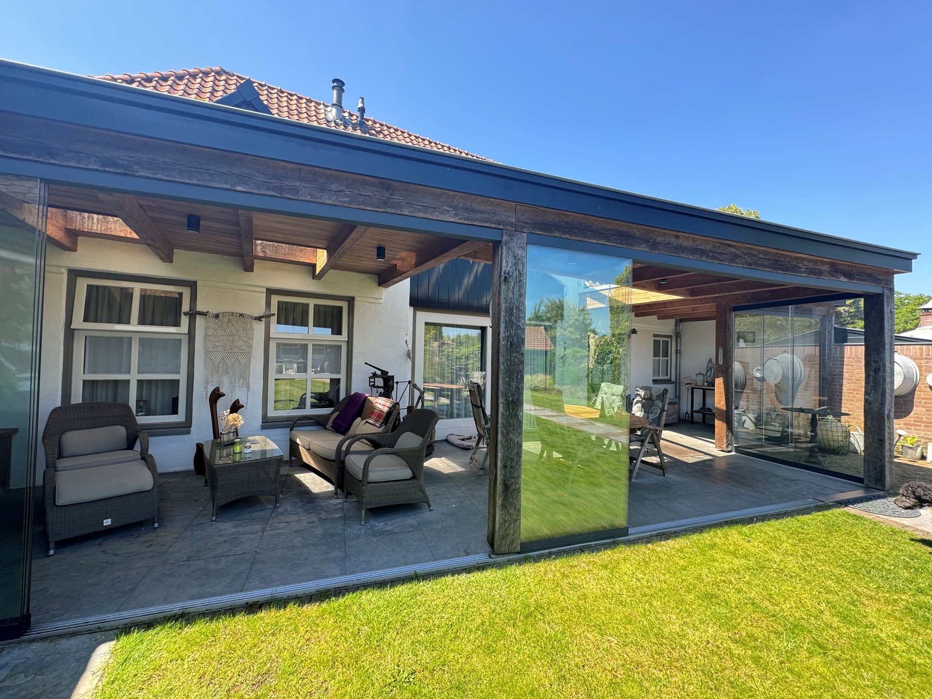Overdekt terras afsluitbaar met glazen schuifwanden. Tuinhuis (guesthouse) geïsoleerd en voorzien van krachtstroom, water, toilet, keukenblok, geiser en gasgevelkachel(s).